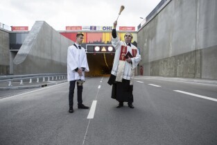 Otwarcie dla ruchu samochodowego tunelu pod Martwą Wisłą w Gdańsku. Nz. Proboszcz Parafii Św. Anny i Joachima w Gdańsku Letnicy ks. Zbigniew Drzał