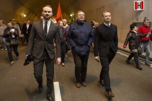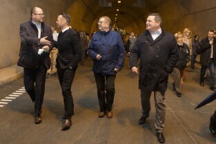 Gdańsk, tunel pod Martwą Wisłą. Piesze zwiedzanie podczas ostatniego dnia otwartego przed oficjalnym udostępnieniem obiektu. Nz. od lewej: Prezydent Gdańska Paweł Adamowicz, Sławomir Nowak, Prezes Gdańskich Inwestycji Komunalnych Ryszard Trykosko, Paweł Orłowski