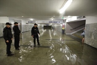 Ulewa w Gdańsku, podtopione ulice, tunele i budynki. Nz Tunel na dworcu PKP Gdańsk Główny, partol Policji i Straży Ochrony Kolei.