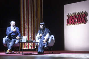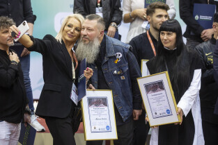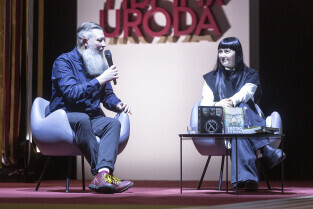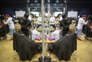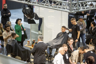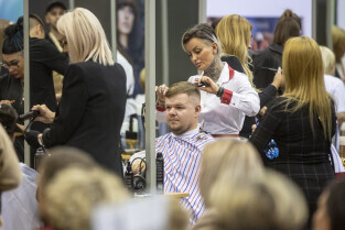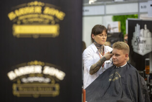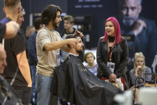 Gdańsk. W halach targowych AmberExpo odbyła się kolejna edycja targów skierowanych do specjalistów z branży beauty - Uroda 2022. Nz. Barber Adam Szulc oraz stylistka Jaga Hupało.