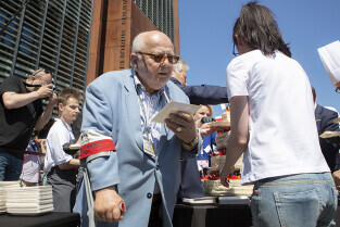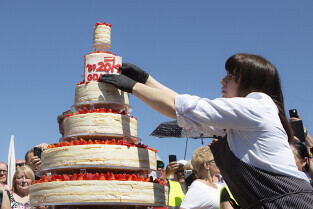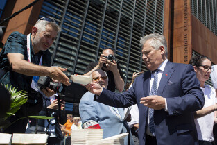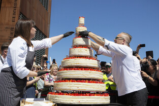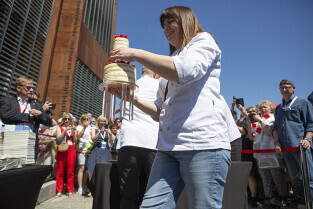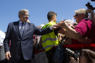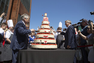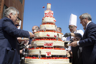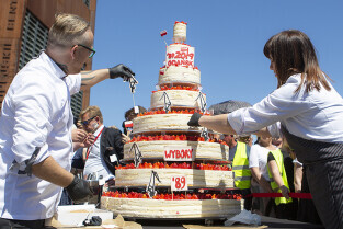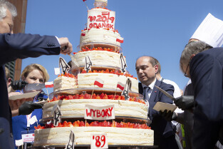 Tort na 30 rocznicę cześciowo wolnych wyborów, krojony przez byłych prezydentów RP Aleksandra Kwaśniewskiego i Bronisława Komorowskiego oraz dyrektora ECS Basila Kerskiego