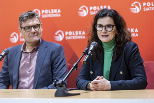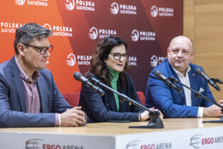 Gdańsk. W hali Ergo Arena odbył się mecz 29. rundy PlusLigi w siatkówce mężczyzn pomiędzy Treflem Gdańsk i Exact Systems Hemarpol Częstochowa. Nz. Prezydent Aleksandra Dulkiewicz, Adam Korol i JJacek Sęk, Wiceprezes Zarządu PZPS w trakcie konferencji prasowej przed meczem.