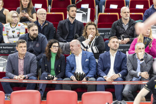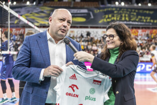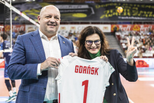 Gdańsk. W hali Ergo Arena odbył się mecz 29. rundy PlusLigi w siatkówce mężczyzn pomiędzy Treflem Gdańsk i Exact Systems Hemarpol Częstochowa. Nz. Prezydent Aleksandra Dulkiewicz odbiera koszulkę reprezentacji z rąk Jacka Sęka, wiceprezesa PZPS.