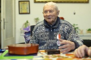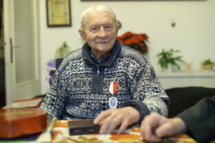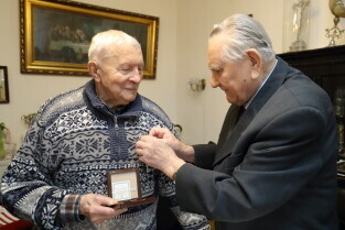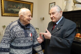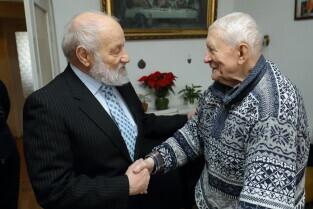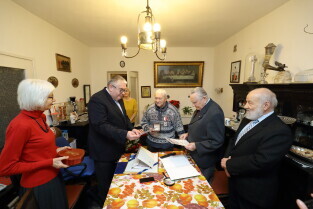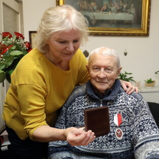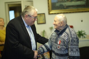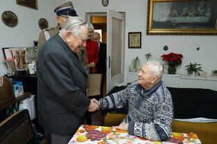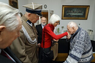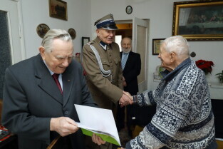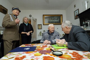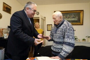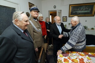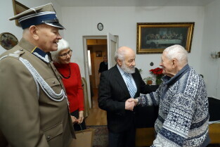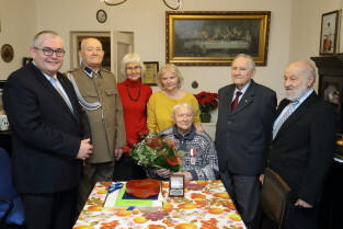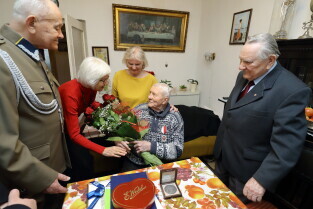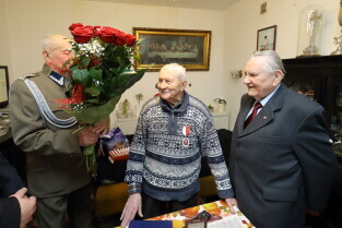 Gdańsk. Urodziny 104-latka Adama Serafina. Życzenia Jubilatowi złożyli Wiceprezydent Gdańska Piotr Kowalczuk i delegacja Rady Kombatantów i Osób Represjonowanych Województwa Pomorskiego na czele z Przewodniczącym Rady Henrykiem Bajduszewskim.