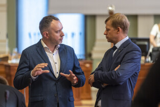 Gdańsk. V Sesja Rady Miasta. Nz. Radni Michał Hajduk i Karol Ważny