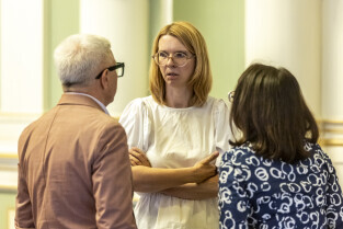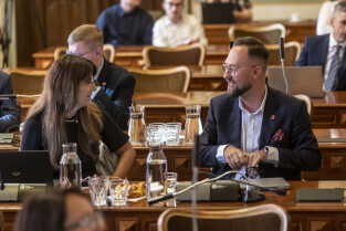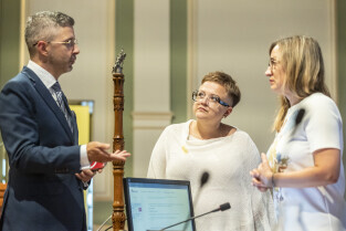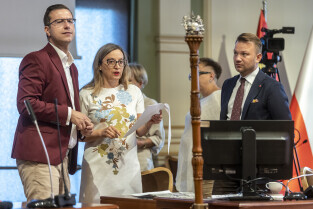 Gdańsk. V Sesja Rady Miasta. Nz. Radny Cezary Śpiewak-Dowbór, Przewodnicząca Rady Agnieszka Owczarczak oraz wiceprzewodniczący Mateusz Skarbek