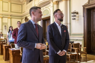 Gdańsk. V Sesja Rady Miasta. Nz. Michał Hajduk i Krystian Kłos składają ślubowanie na radnego.