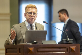 Gdańsk. V Sesja Rady Miasta. Nz. Radny Krystian Kłos