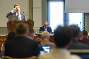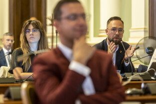 Gdańsk. V Sesja Rady Miasta. Nz. Radny Michał Hajduk