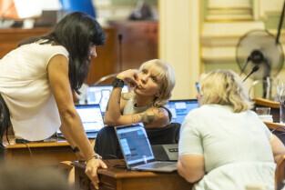 Gdańsk. V Sesja Rady Miasta. Nz. Z powodu upałów, które dotarły do Gdańska, w pewnym momencie temperatura na sali obrad zrobiła się na tyle nieznośna, że trzeba było uruchomić dodatkowe wentylatory.
