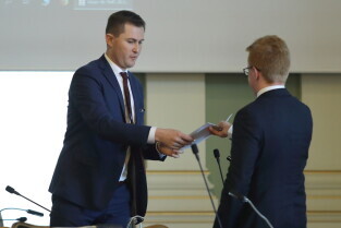 Gdańsk. VIII Sesja Rady Miasta Gdańska. Nz. Wiceprezydenci Gdańska: Piotr Borawski i Piotr Grzelak.