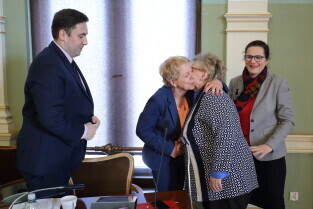 Gdańsk. VIII Sesja Rady Miasta Gdańska. Nz. Radna Teresa Wasilewska. Wiceprezydent Gdańska PIotr Borawski, Danuta Janczarek, Radna Teresa Wasilewska i Prezydent Gdańska Aleksandra Dulkiewicz.