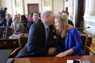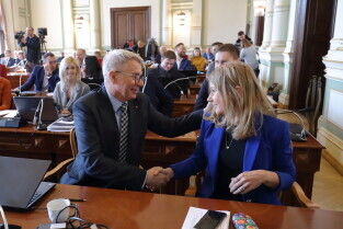 Gdańsk. VIII Sesja Rady Miasta Gdańska. Nz. Radny Andrzej Kowalczys i Radna Beata Dunajewska.