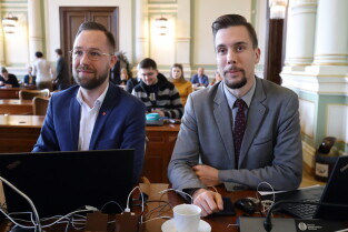 Gdańsk. VIII Sesja Rady Miasta Gdańska. Nz. Radni: Krystian Kłos i Łukasz Bejm.