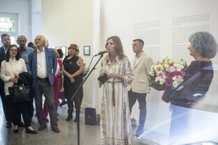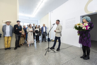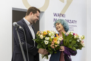 Gdańsk. W Gdańskiej Galerii Miejskiej odbył się wernisaż wystawy Małgorzaty Żerwe pt.:"Wątki". Nz. Radny Maksymilian Kieturakis wręcza autorce nagrody Prezydenta Miasta Gdańska w dziedzinie kultury.