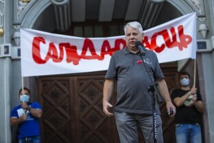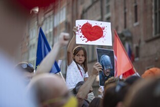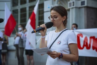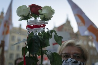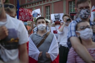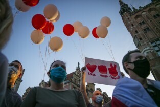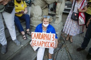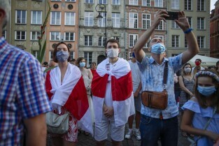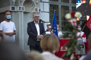 Gdańsk, Długi Targ. Wiec poparcia dla opozycji na Białorusi, gdzie trwają protesty po prawdopodobnie sfałszowanych wyborach prezydenckich. W zgromadzeniu wzięli udział z-ca prezydenta Gdańska Piotr Kowalczuk i wicemarszałek Senatu Bogdan Borusewicz