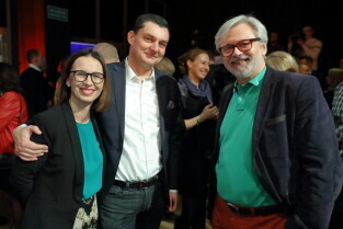 Gdańsk. Wieczór wyborczy Aleksandry Dulkiewicz. Nz. Katarzyna Hall, Bożena Rybicka-Grzywaczewska i Aleksander Hall.