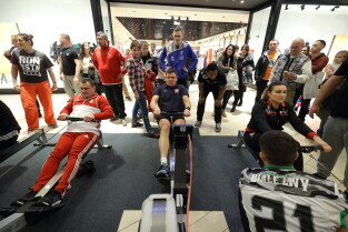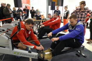 Gdańsk, Park Handlowy Matarnia. Wiosłowanie na ergometrze. Gdańsk jako jedno z 7. polskich miast, próbuję pobić rekord Polski w wiosłowaniu. Nz. Ryszard Świlski, Leszek Blanik i Adam Korol.