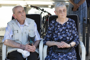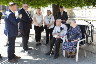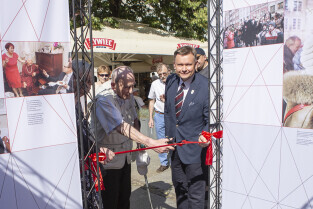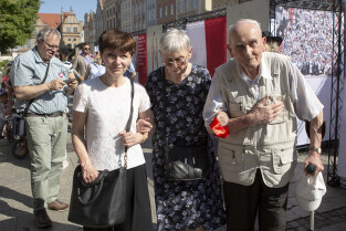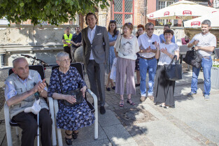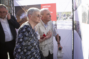 Gdańsk Długi Targ. Wystawa fotograficzna: Budowanie wspólnoty, Paweł Adamowicz i Gdańszczanie. Nz. rodzice Pawła Adamowicza Ryszard i Teresa Adamowicz