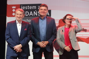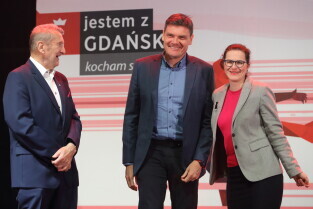 Gdańsk. XI Gala Sportu Młodzieżowego. Nz. Włodzimierz Mechnikowski-Dziennikarz Radio Gdańsk, Prof. Wojciech Przybylski - przewodniczący Gdańskiej Rady Sportu i Prezydent Gdańska Aleksandra Dulkiewicz.