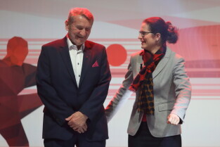 Gdańsk. XI Gala Sportu Młodzieżowego. Nz. Prof. Wojciech Przybylski - przewodniczący Gdańskiej Rady Sportu i Prezydent Gdańska Aleksandra Dulkiewicz.