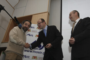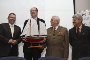 Podpisanie umowy zakupu przez Miasto Gdańsk żaglowca y/s Generał Zaruski od Ligii Obrony Kraju. Nz. z modelem żaglowca: Skarbnik Gdańska Andrzej Bojanowski, Przewodniczący RMG Bogdan Oleszek, Prezydent Gdańska Paweł Adamowicz i Prezes LOK Grzegorz Jarząbek