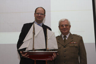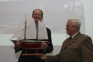 Podpisanie umowy zakupu przez Miasto Gdańsk żaglowca y/s Generał Zaruski od Ligii Obrony Kraju. Nz. z modelem żaglowca: Prezydent Gdańska Paweł Adamowicz i Prezes LOK Grzegorz Jarząbek