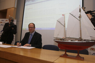 Podpisanie umowy zakupu przez Miasto Gdańsk żaglowca y/s Generał Zaruski od Ligii Obrony Kraju. Nz. zobowiązanie o przeprowadzeniu rewitalizacji żaglowca podpisuje Paweł Adamowicz, Prezydent Gdańska