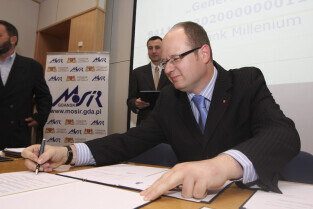 Podpisanie umowy zakupu przez Miasto Gdańsk żaglowca y/s Generał Zaruski od Ligii Obrony Kraju. Nz. akt notarialny podpisują: Prezydent Gdańska Paweł Adamowicz i Prezes LOK Grzegorz Jarząbek