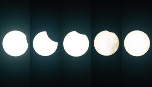 Gdańsk. Przez kilka dziesiąt minut można było obserwować częściowe zaćmienie słońca nad gdańskiem. Księżyc zasłonił naszą gwiazdę w zaledwie 13%. Nz. Fotomontaż z p[ięciu faz zaćmienia