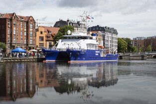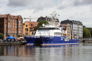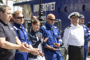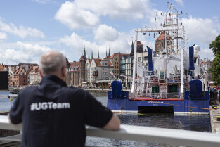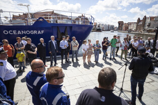 Gdańsk. Na nabrzeżu w pobliżu Targu Rybnego odbyło się uroczyste powitanie powracającego z rejsu statku badawczego Uniwersytetu Gdańskiego "Oceanograf".