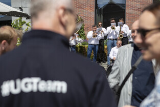 Gdańsk. Na nabrzeżu w pobliżu Targu Rybnego odbyło się uroczyste powitanie powracającego z rejsu statku badawczego Uniwersytetu Gdańskiego "Oceanograf". Nz. Rektor UG prof. Piotr Stepnowski przyjmuje raport po zakończeniu rejsu od kapitana Andrzeja Wawrzyniaka