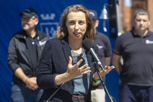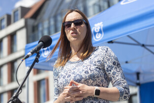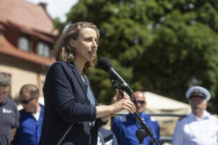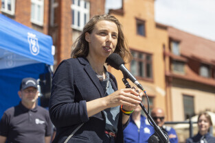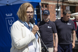 Gdańsk. Na nabrzeżu w pobliżu Targu Rybnego odbyło się uroczyste powitanie powracającego z rejsu statku badawczego Uniwersytetu Gdańskiego "Oceanograf". Nz. Przy mikrofonie Zastępczyni Prezydenta ds. rozwoju społecznego i równego traktowania Monika Chabior.