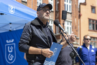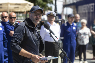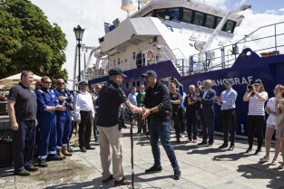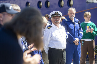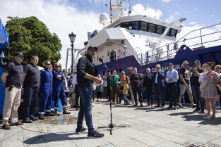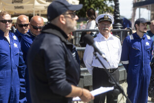 Gdańsk. Na nabrzeżu w pobliżu Targu Rybnego odbyło się uroczyste powitanie powracającego z rejsu statku badawczego Uniwersytetu Gdańskiego "Oceanograf". Nz. Oleksandr Plodystyi, Konsul Generalny Ukrainy w Gdańsku.