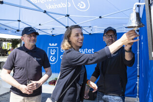 Gdańsk. Na nabrzeżu w pobliżu Targu Rybnego odbyło się uroczyste powitanie powracającego z rejsu statku badawczego Uniwersytetu Gdańskiego "Oceanograf". Nz. W towarzystwie kapitana rejsu Andrzeja Wawrzyniaka(L) Zastępczyni Prezydenta ds. rozwoju społecznego i równego traktowania Monika Chabior oraz rektor UG, prof. Piotr Stepnowski dzwonem oficjalnie kończą rejs "Oceanografa".