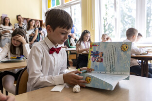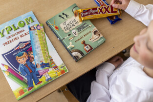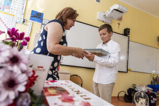 Gdańsk. W szkole Podstawowej Nr 80 na Przymorzu odbyło się uroczyste zakończenie roku szkolnego z udziałem Przewodniczącej Rady Miasta Agnieszki Owczarczak. Nz. Wychowawczyni klasy 3b Magdalena Kamieniecka rozdaje świadectwa swoim uczniom