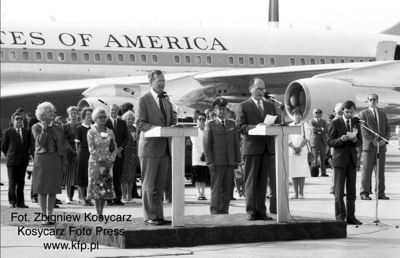 Pożegnanie prezydenta Stanów Zjednoczonych Georga Busha przez Wojciecha Jaruzelskiego na lotnisku w Gdańsku - Rębiechowie. 11.07.1989