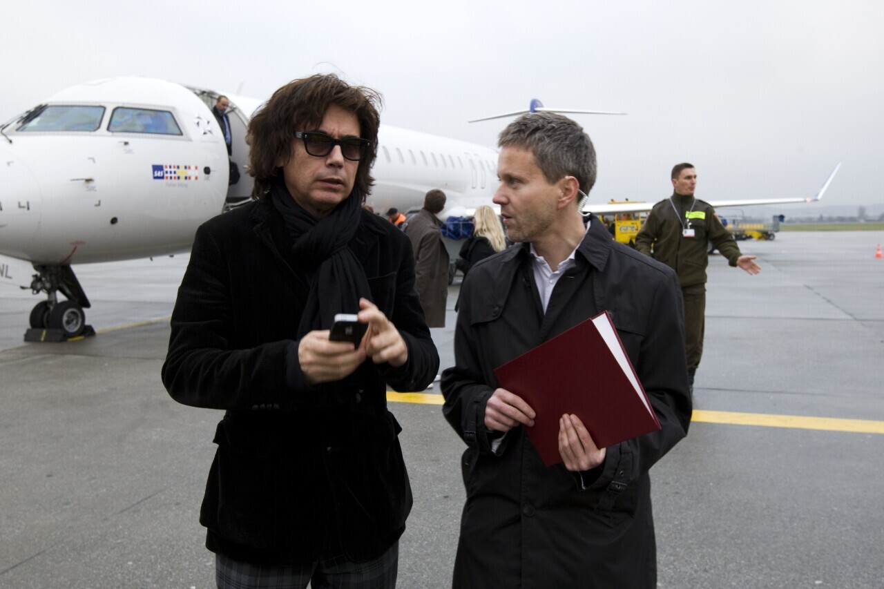 Francuski muzyk Jean-Michel Jarre witany na płycie lotniska Gdańsk-Rębiechowo przez Macieja Buczkowskiego z gdańskiego magistratu