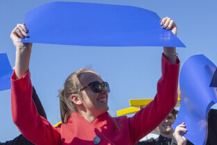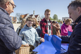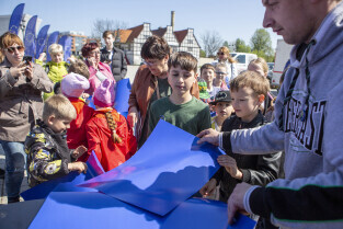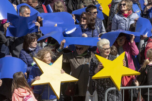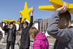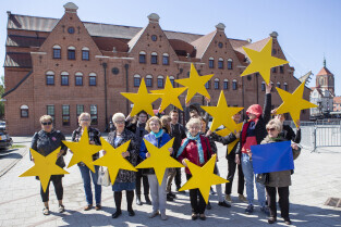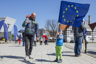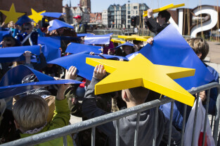 Żywa flaga Unii Europejskiej ułożona z okazji 15 rocznicy wstąpienia Polski do UE. Gdańsk, Ołowianka