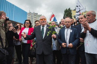 Gdańsk. Rocznica Porozumień Sierpniowych. Składanie kwiatów razem z Lechem Wałęsą i symboliczne otwarcie Historycznej Bramy nr 2 Stoczni Gdańskiej. Nz. Poseł Jerzy Borowczak, Prezydent Lech Wałęsa i Henryka Krzywonos-Strycharska