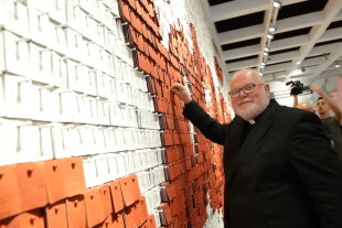 Gdańsk. Wizyta Kardynała prof. Reinharda Marxa w Europejskim Centrum Solidarności, zwiedzanie wystawy stałej ECS, spotkanie z Lechem Wałęsą i złożenie kwiatów pod pomnikiem Poległych Stoczniowców.