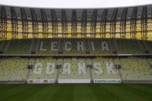 Stadion PGE Arena w Gdańsku Letnicy. Napis z nazwą klubu piłkarskiego "Lechia Gdańsk" ułożony z pomalowanych na biało krzesełek.