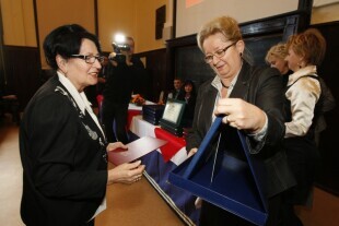 Prezydent Gdańska Paweł Adamowicz wręczył Nagrodę w Dziedzinie Kultury Barbarze Żurowskiej-Sutt. Gdańsk, Urząd Miejski