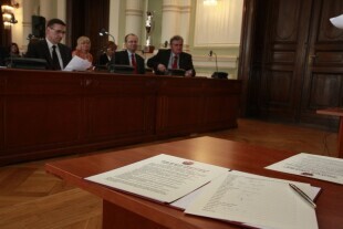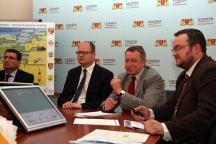 Gdańsk, Urząd Miejski. Podpisanie umowy na budowę mostu zwodzonego w Przegalinie. Budowa przeprawy w Przegalinie to część programu aktywizacji dróg wodnych na drodze wodnej E-70 – w projekcie „Pętla Żuławska – rozwój turystyki wodnej. Etap I”