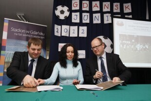 Podpisanie umowy na budowę boiska przy Gimnazjum nr 3 na gdańskim Chełmie w ramach projektu Gdańsk Junior 2012. Budowę sponsoruje firma deweloperska Euro Styl
