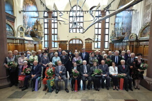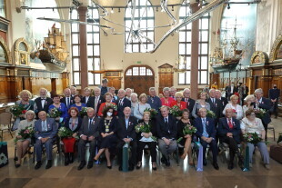 Gdańsk. Jubileusz Par Małżeńskich - Złote Gody, podczas których Prezydent Gdańska Aleksandra Dulkiewicz wręczyła medale za długoletnie pożycie małżeńskie.