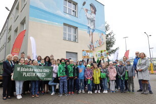 Gdańsk.Uroczyste odsłonięcie muralu Gdańsk bez plastiku na elewacji SP nr 7. Autorem muralu jest trójmiejski artysta Marek Looney Rybowski.