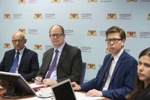 Spotkanie Prezydenta Gdańska Pawła Adamowicza z delegacją z ukraińskiego Mariupola, w składzie której znaleźli się m.in. Mer Mariupola Jurij Chotłubiej i Poseł do Rady Najwyższej Ukrainy Siergiej Taruta. Gdańsk, Europejskie Centrum Solidarności