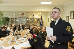 Coroczne spotkanie Prezydenta Gdańska Pawła Adamowicza i jego zastępców z kierownictwem Straży Miejskiej w Gdańsku. Podsumowanie działań w 2014 roku oraz omówienie planów na rok 2015. Gdańsk, siedziba Straży Miejskiej przy ul. Elbląskiej