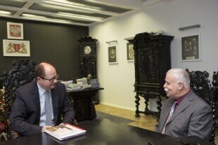 Spotkanie Prezydenta Gdańska Pawła Adamowicza z Jackiem Nowakowskim ze Stowarzyszenia Gdańszczan w Kanadzie. Gdańsk, Urząd Miejski